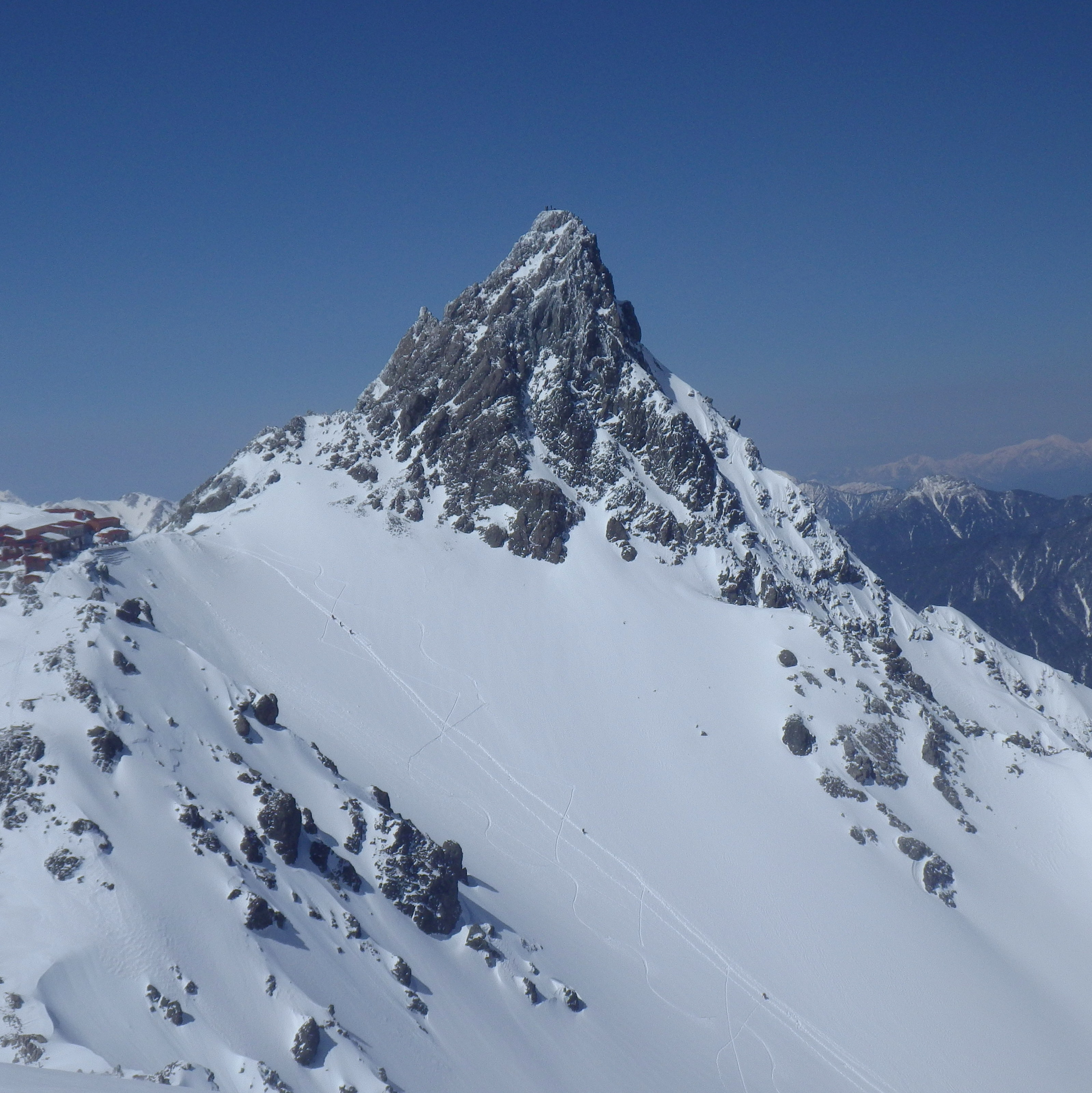 この下りがなかなかの急斜面で注意が必要です。お尻で滑ったと思われるトレースは凍っています。